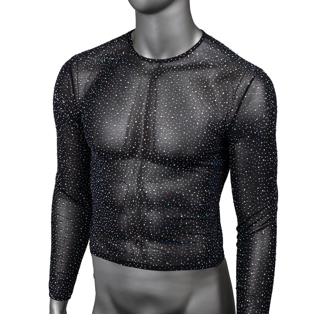This comfy, breathable, barely-there mesh top covers just enough, but peek-a-boos (it's sheer) your arms, abs and chest as zillions of iridescent rhinestones twinkle away. Wear it solo or as a surprise layer for instant glam.