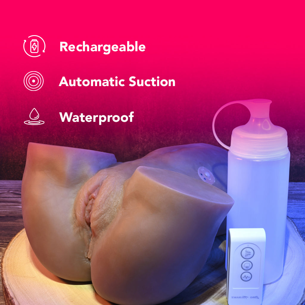 The Rear Beauty is conveniently compatible with any favorite water-based lube, and easy to clean with soapy water or a good toy care fluid/foam. It's 9.6"/24.4cm long, 9.5"/24.3cm wide and 5.31/13.5cm penetrable