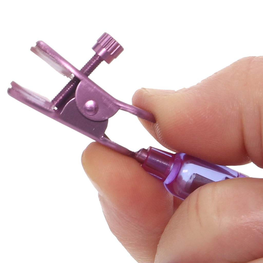 Once they're in place, these fully adjustable mini clips tug and tease your nipples while also vibrating. Position them where you like, tightening or loosening the spacer screw to increase or decrease the pinch level. A wired remote activates and controls variable steady, buzzy stimulation speeds.