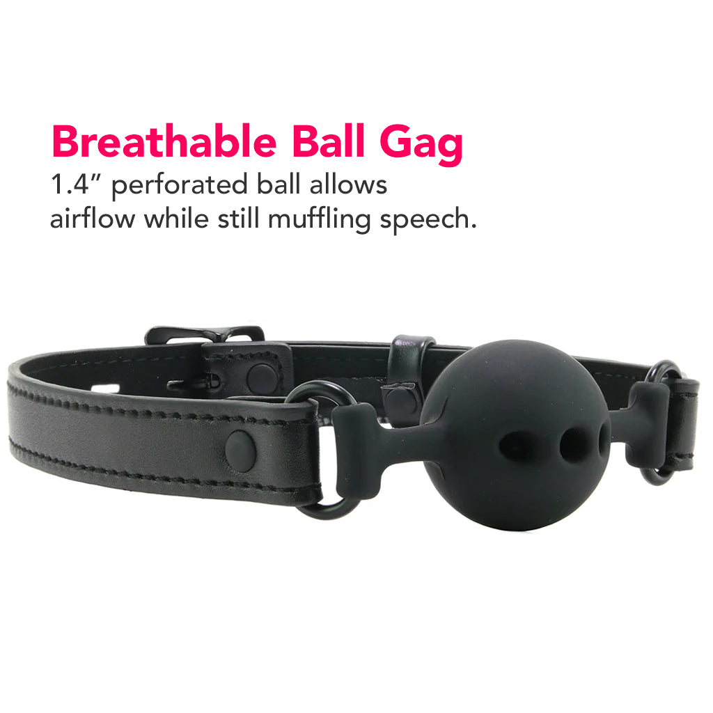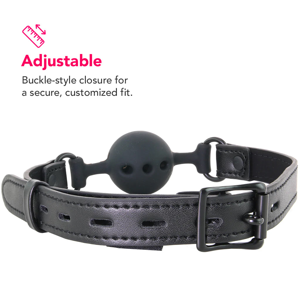 Filling their mouth with a smooth 1.4" (3.6cm) perforated sphere, the Gag buckles securely into place using a looped pin that can be locked with a padlock, if you'd like (padlock not included). Like any gag, please keep a watchful eye on your bound up partner to be sure they can breath/swallow comfortably. In other words, play safe!