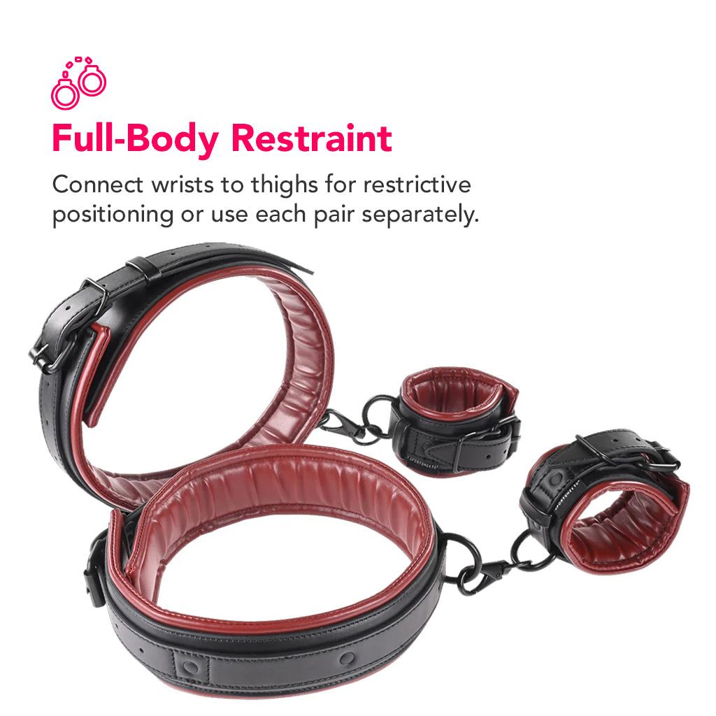 Inside, you'll find two sets of cuffs, one smaller and great for wrists, and the other larger and made for thighs/legs. Using the two in combination, you'll be able to keep their arms in close proximity to their legs, but you could also use either set solo thanks to simple, sturdy swiveling hardware.