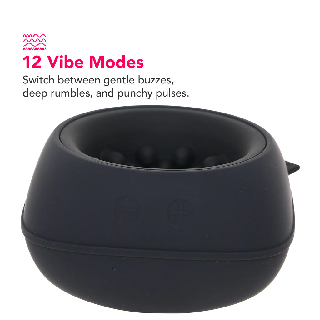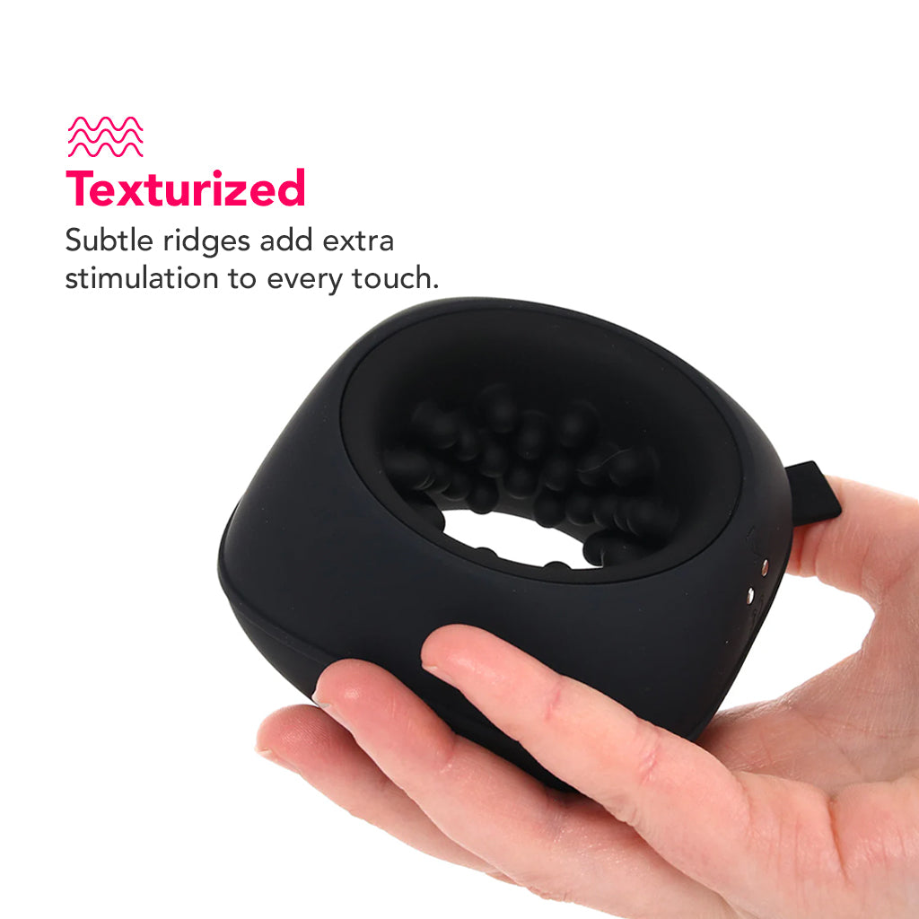 This compact vibrator-stroker hybrid fits neatly in your hand and even neater in a travel bag. The squishy ring opening hugs your hotspots with soft silicone, while the textured inner cushion gives you just the right amount of grip. Its shape makes it great for focused glans teasing or sliding along the entire shaft for more full-bodied vibes.