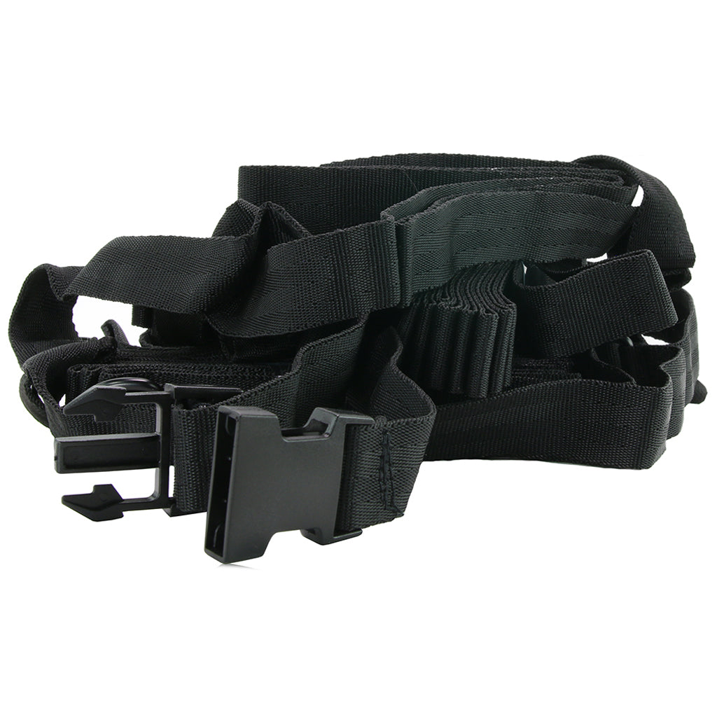 Criss-crossing over and under the mattress, the 8 Points straps form a unique square, allowing for cuff attachment at top, bottom and sides at various heights. Adjusting easily to fit up to a California King, the straps feature universal D ring's compatible with most bondage gear along with the included brocade tethers.