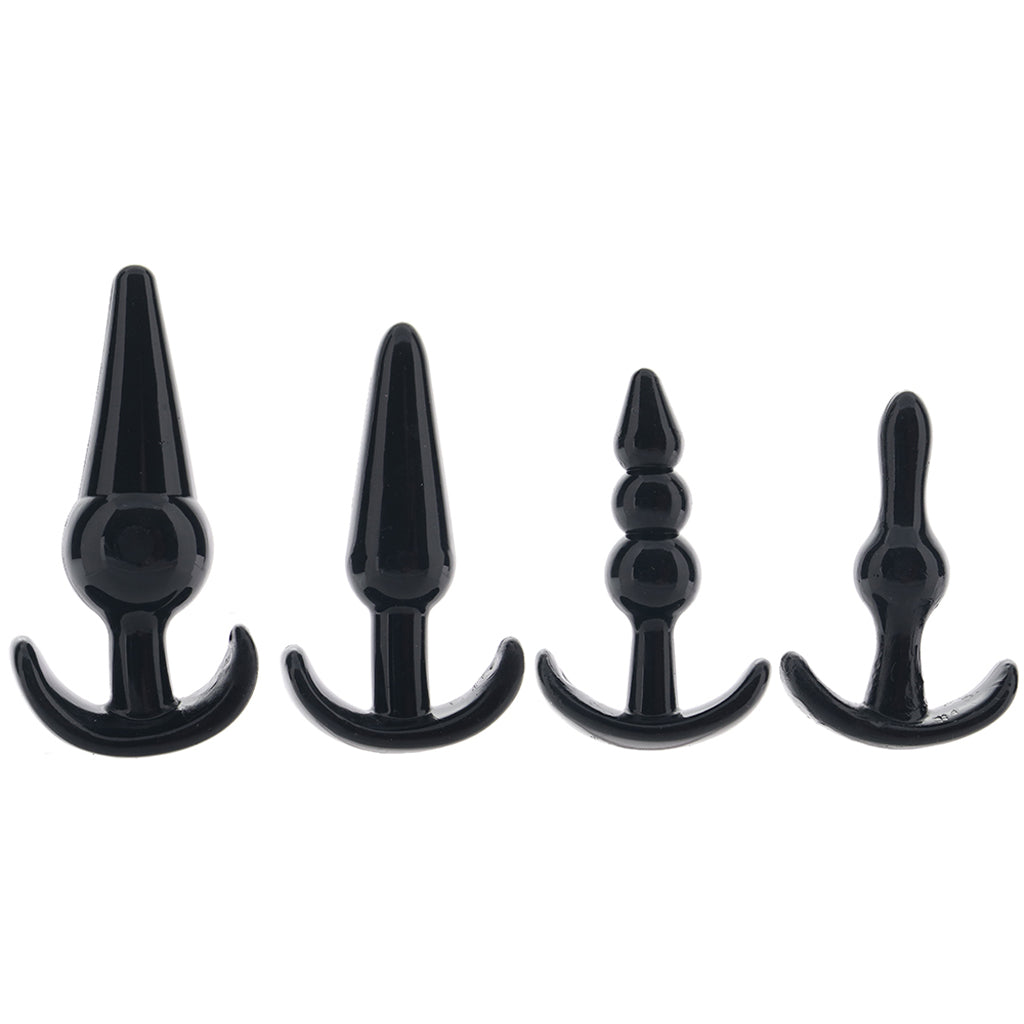 Inside, you'll find four tapered Plugs in plushy black elastomer. They'll each offer you and/or your partner easy insertion, quick adjustments and worry-free removal, but the similarities stop there. Each is shaped and sized for a distinct sensation - there's a classic taper, a bottle-shaped double swell, a triple-beaded version and a big taper/swell combo.