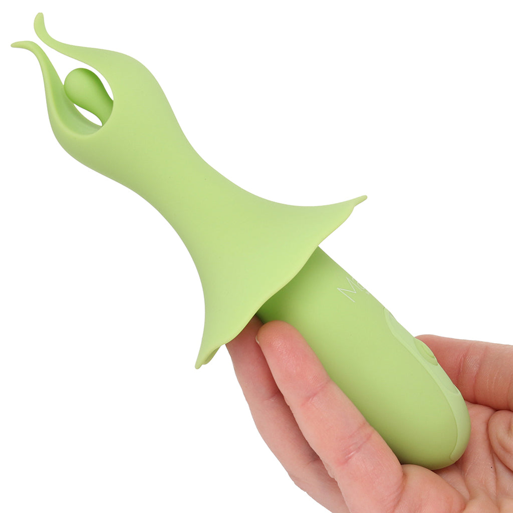 Up top, this pretty little vibe splits into two super-soft petals on either side of a tiny round bud; down below, a flared skirt makes Sienna safe for penetration. Hit one button on the curvy handle to activate and cycle through ten vibration patterns; they'll make that sexy tip dance.