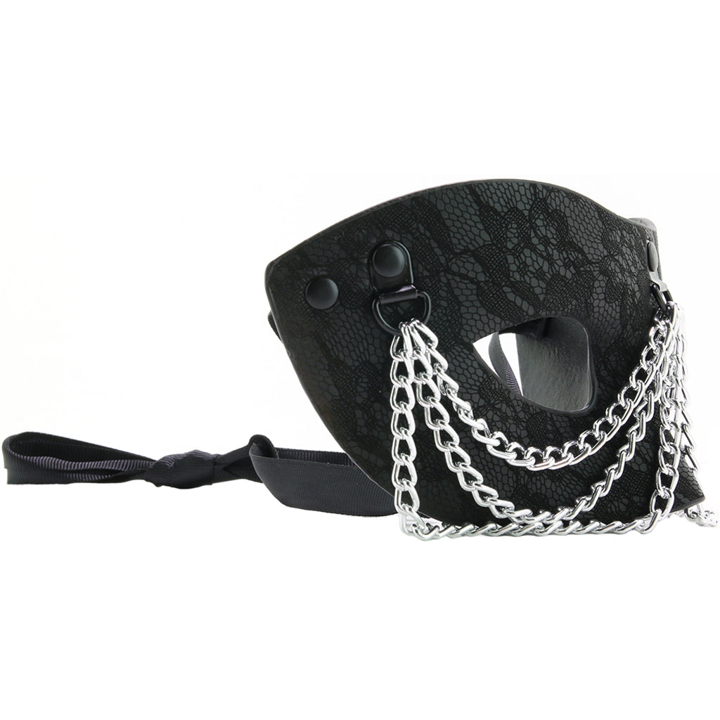 In classic masquerade style, the contoured black lace patterned shape fits over the top of the face, leaving eyes wide and free to seduce. Effortlessly adding an air of mystery as it conceals just enough, the Mask features swooping lengths of delicate silvery chain to hypnotize and captivate. Silky ties secure around the back of the head.