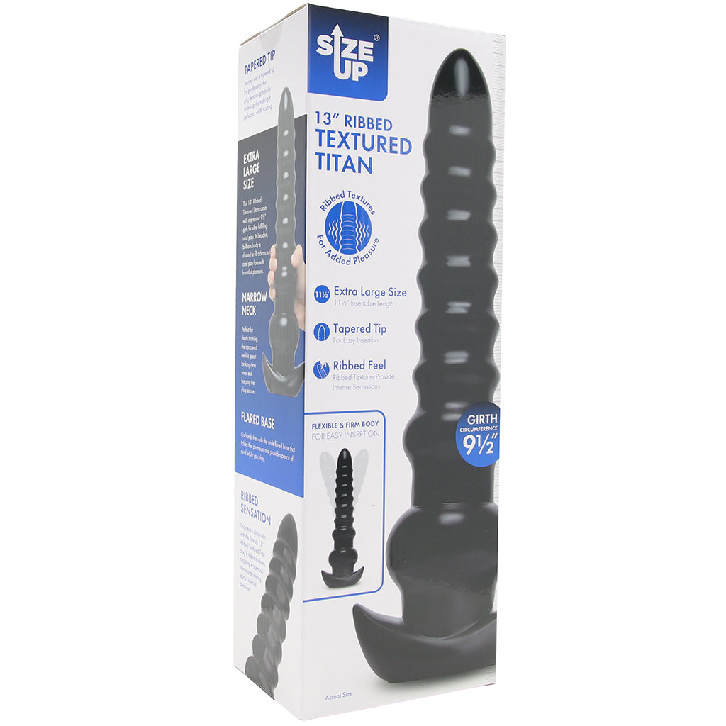 The PVC SizeUp 13” Ribbed Textured Titan Plug is easy to clean and safe with all your favorite water-based lubes.