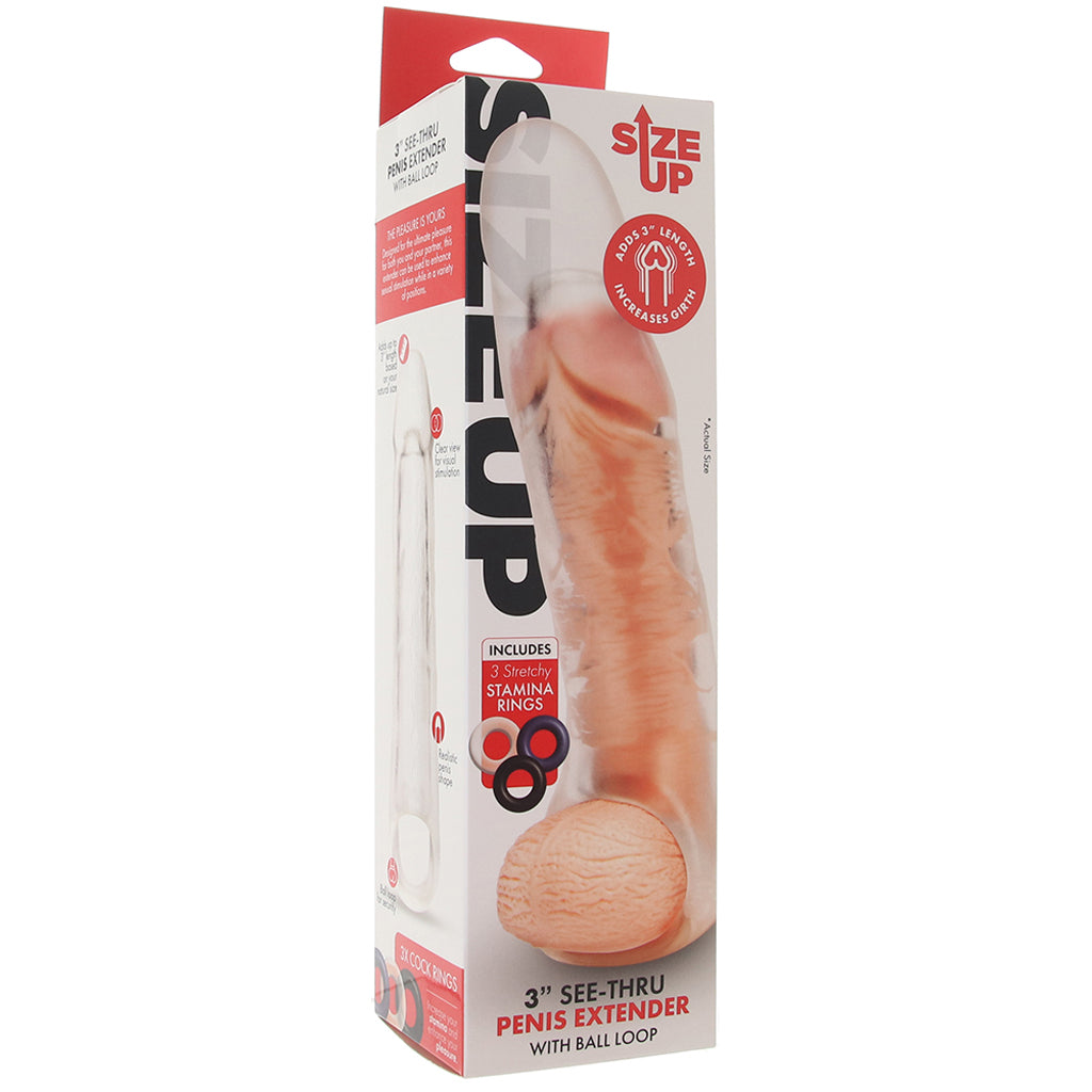 When the need (or want) for a little more length and thickness, ahem, arises, forget pumping, pills, or complicated enlargers, and slip on Size Up's 3 Inch Extender. Soft, stretchy and real-feeling, this simple sleeve adds about three inches of length plus extra thickness. Also, the crystal clear material is naturally magnifying!