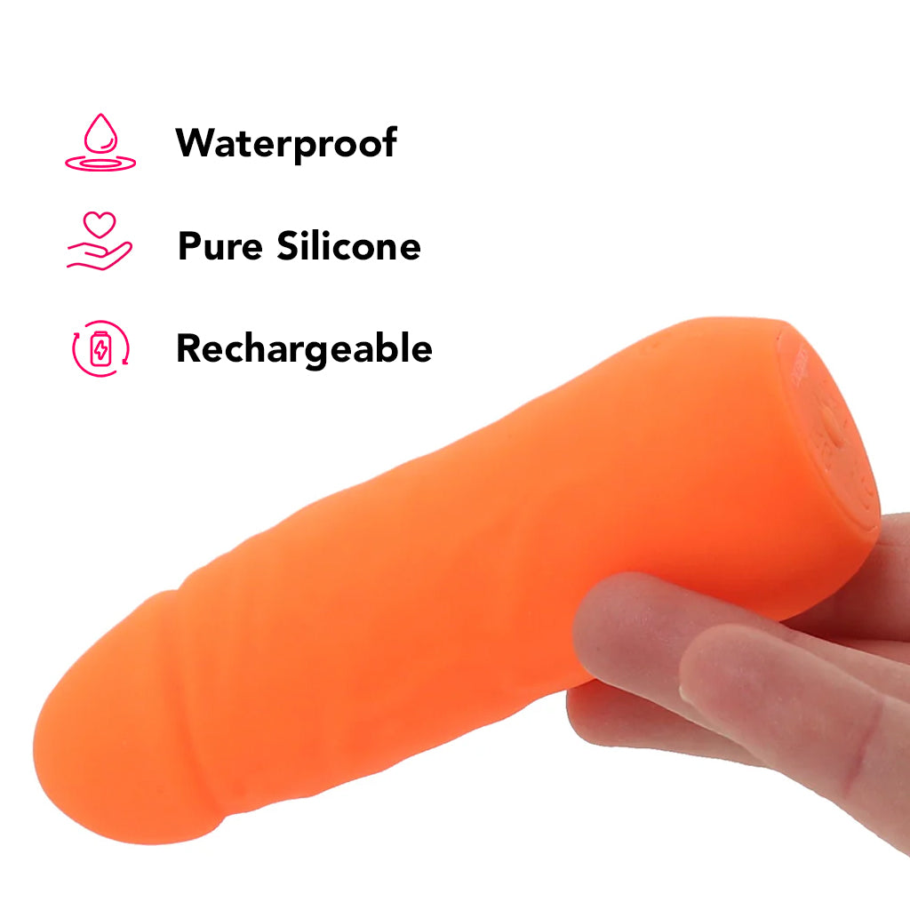 In CalExotics' signature liquid silicone, the Mini is body-safe and easy to clean and care for. Wash it with soapy water or use a favorite toy care fluid/foam. You can add slipperiness with any water-based lube you love, but please keep it away from silicone-based lubes and other silicone toys. This vibe is USB rechargeable, and the cord is included. Waterproof.