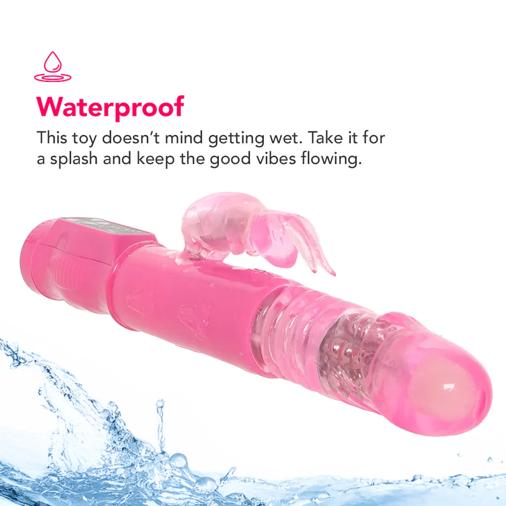 The phthalate-free TPR and ABS plastic Thrusting Bunny is waterproof, easy to clean, battery-operated (3 AAA batteries sold separately), and safe with all your favorite water-based lubes.