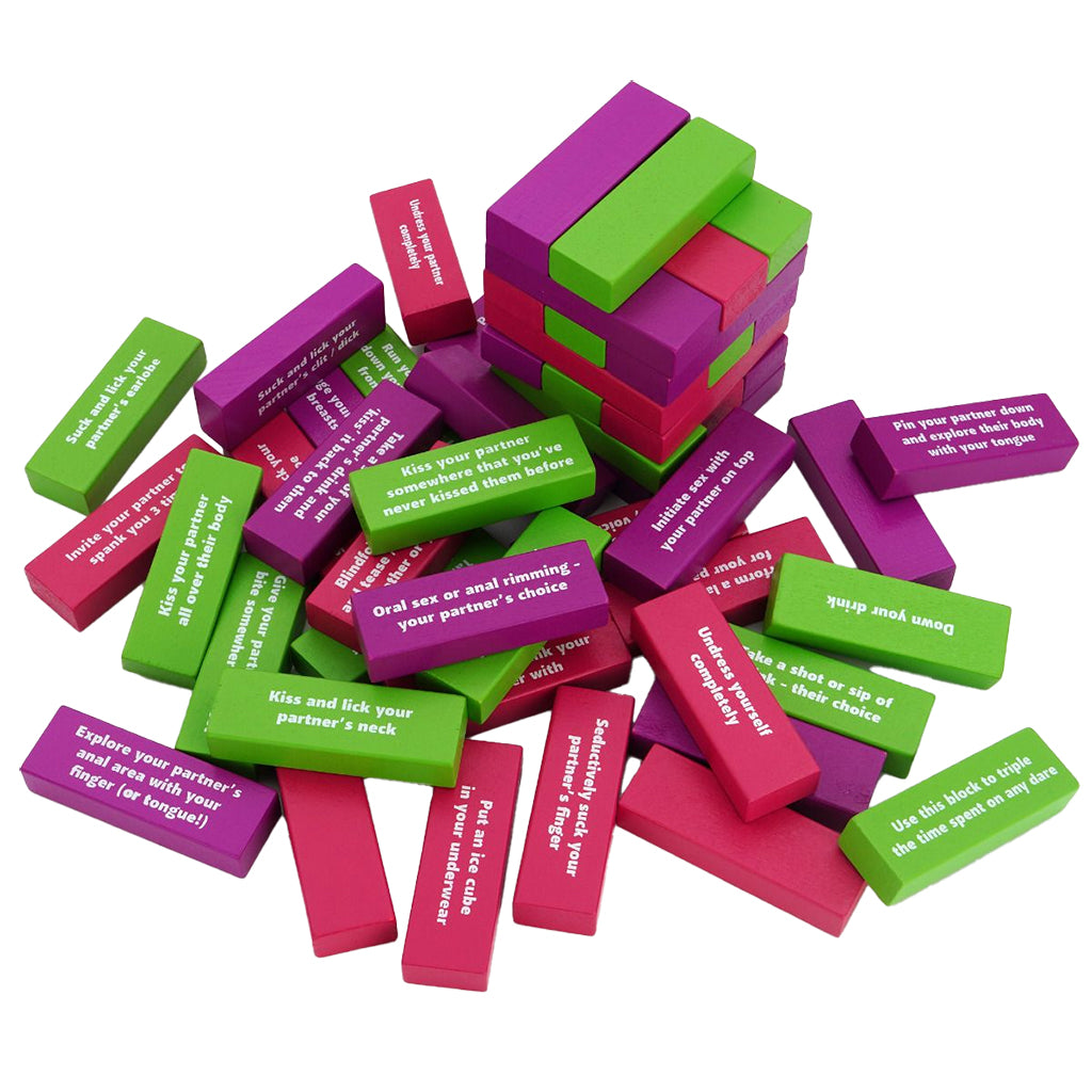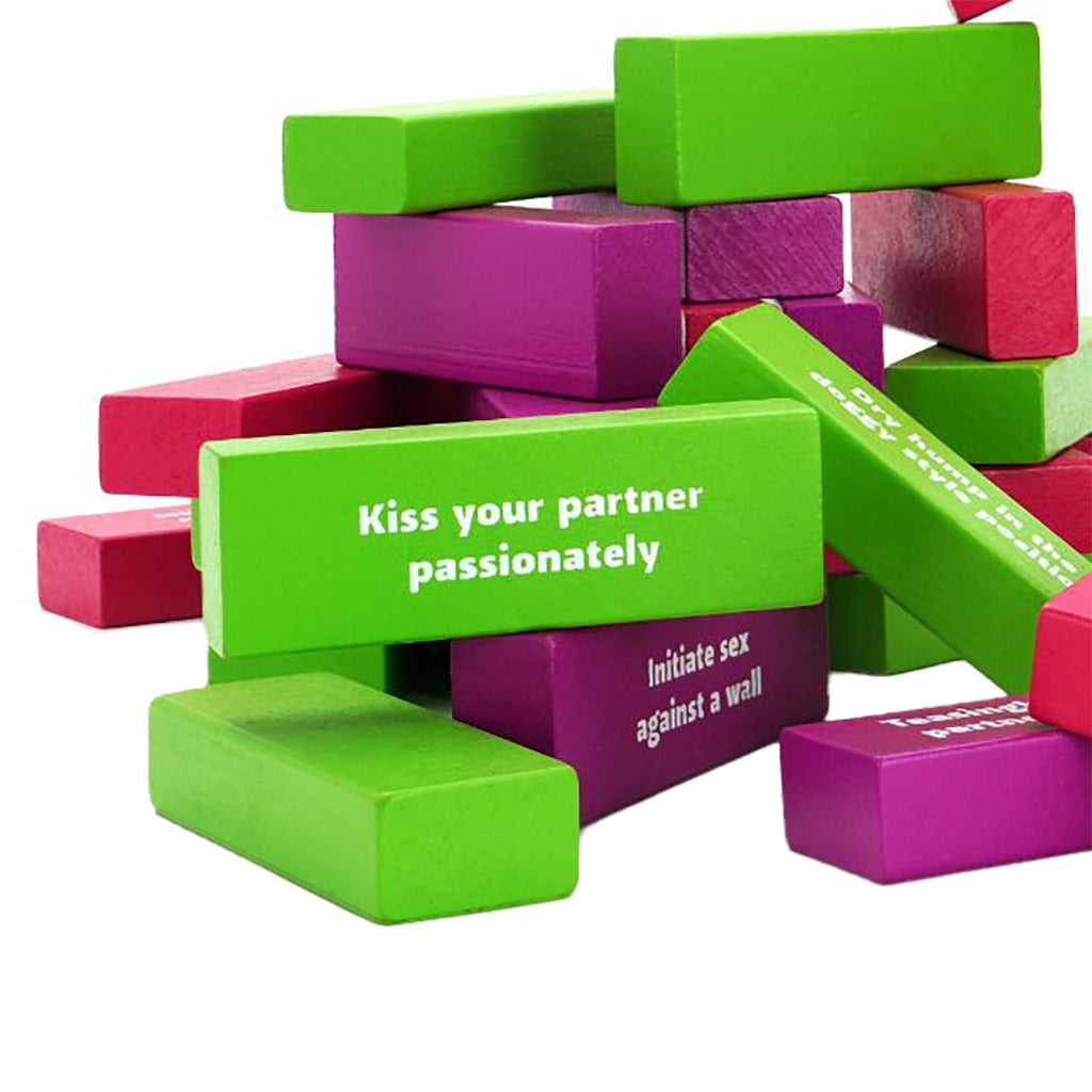 The color system sets the pace. Green keeps things flirty, pink turns up the heat, and purple goes straight for the good stuff. Take turns pulling a block, read your challenge, and decide if you’re in or chickening out. The bolder you play, the more points you earn.
