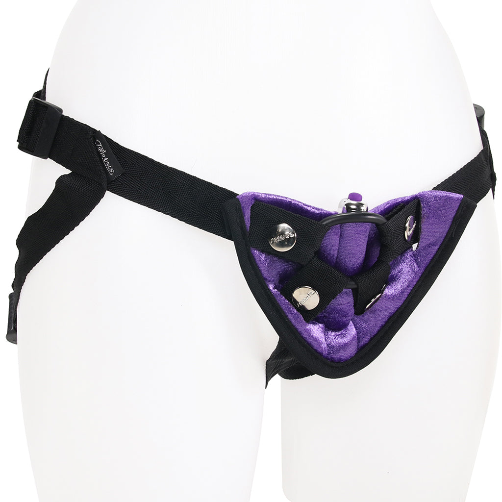 Soft against the skin and super-secure once all strapped in, the velvety purple yoke holds tight to a stretchy silicone O-ring that snaps on and off in a, well...snap! Slip it over the base of a favorite size-compatible penetrator, snap it in, and play away. Note: the included ring stretches from 1.5" (2.5cm) and will fit most toys with a thickest diameter of up to that. You can definitely snap in a larger ring, if you'd like to play with something bigger.