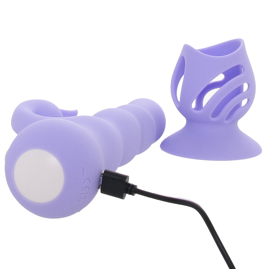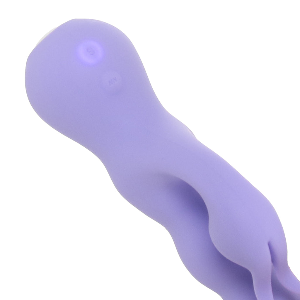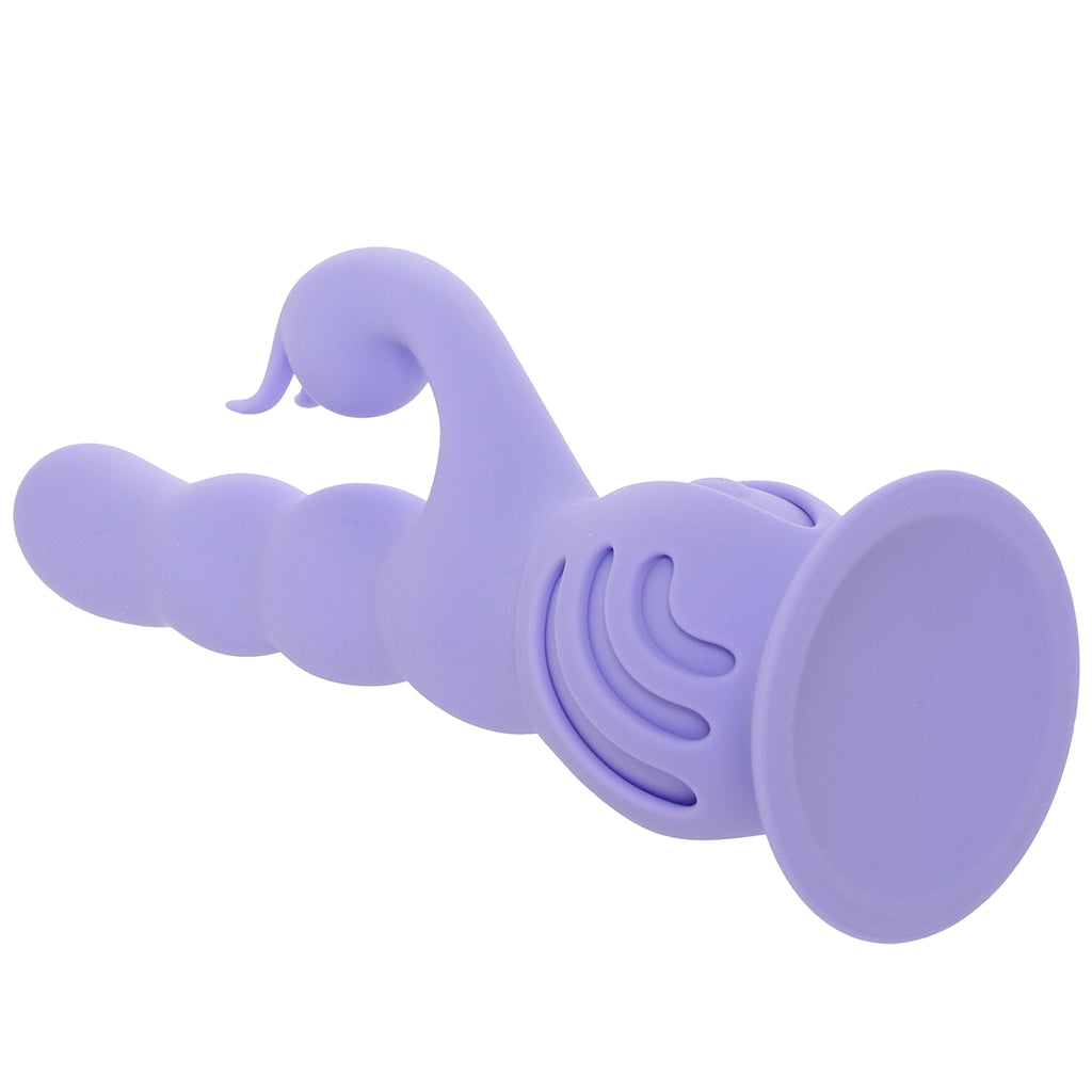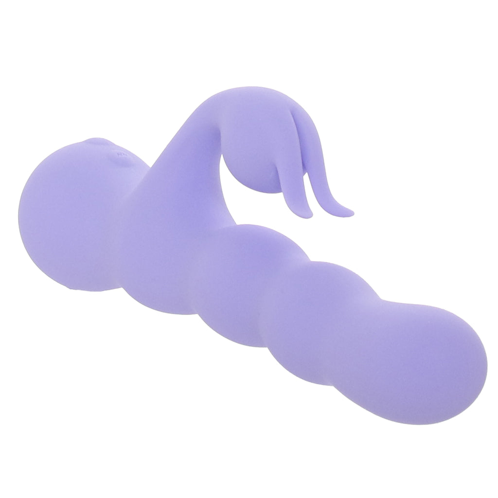This bubbly dual stimulator pairs a bulb-tipped penetrator that moves on its own with a rounded bunny clit/outer stimulator underneath, so you’ve got that inside/outside combo working together right away.
